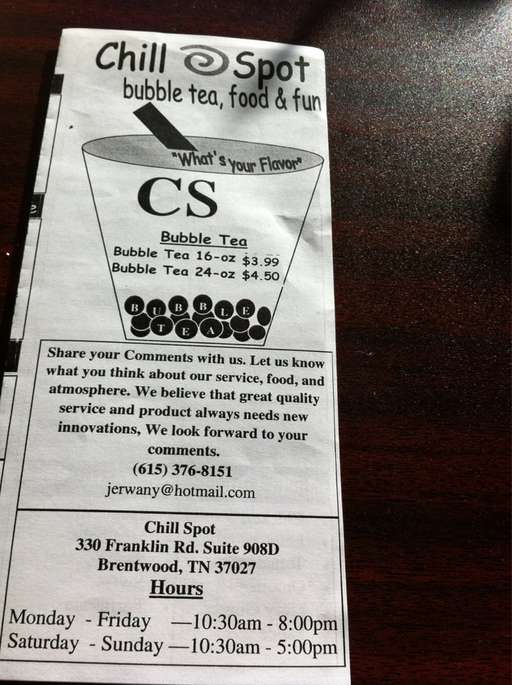 Chill Spot is a cozy spot in Brentwood, TN, offering a versatile menu of wraps, New American dishes, and refreshing bubble teas. With a range of options like Korean fried chicken combos, boba teas in various flavors, and unique dishes like Spicy Pork Kimbap, Chill Spot brings a fusion of flavors to the table. Customers praise the diverse menu offerings, with highlights such as the fire chicken wrap and Thai tea. The relaxed atmosphere and friendly service add to the overall dining experience. While the interior may be a bit understated, the food more than makes up for it. Whether you're looking for a quick bite, a satisfying lunch, or a sweet treat, Chill Spot has something for everyone. Consider stopping by for a taste of Korean-inspired dishes and flavorful bubble teas in a welcoming setting.
